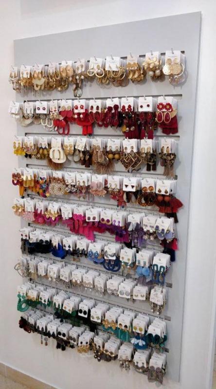 Expositores para bijuteria em chapa composta com reforço em MDF hidrófugo são típicos de montra e loja; furos e recortes são feitos em corte CNC em fresa para alinhamento com ganchos ou hastes.