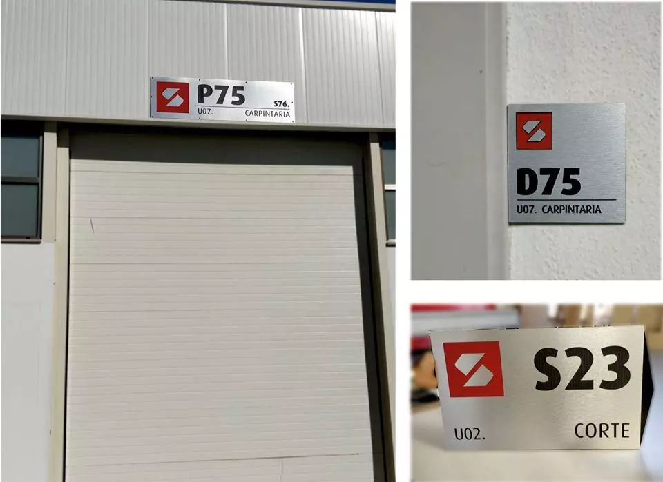 Sinalética em luxbond escovado prata de 3mm com gravação/desbaste e pormenores vermelhos em lasermax/rowmark vermelho