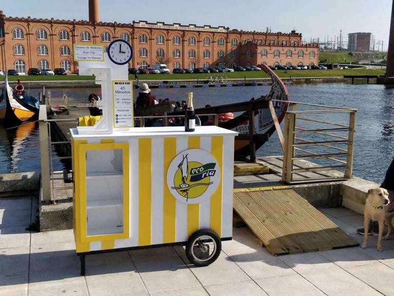 Expositor móvel para venda de bilhetes na Ria de Aveiro.