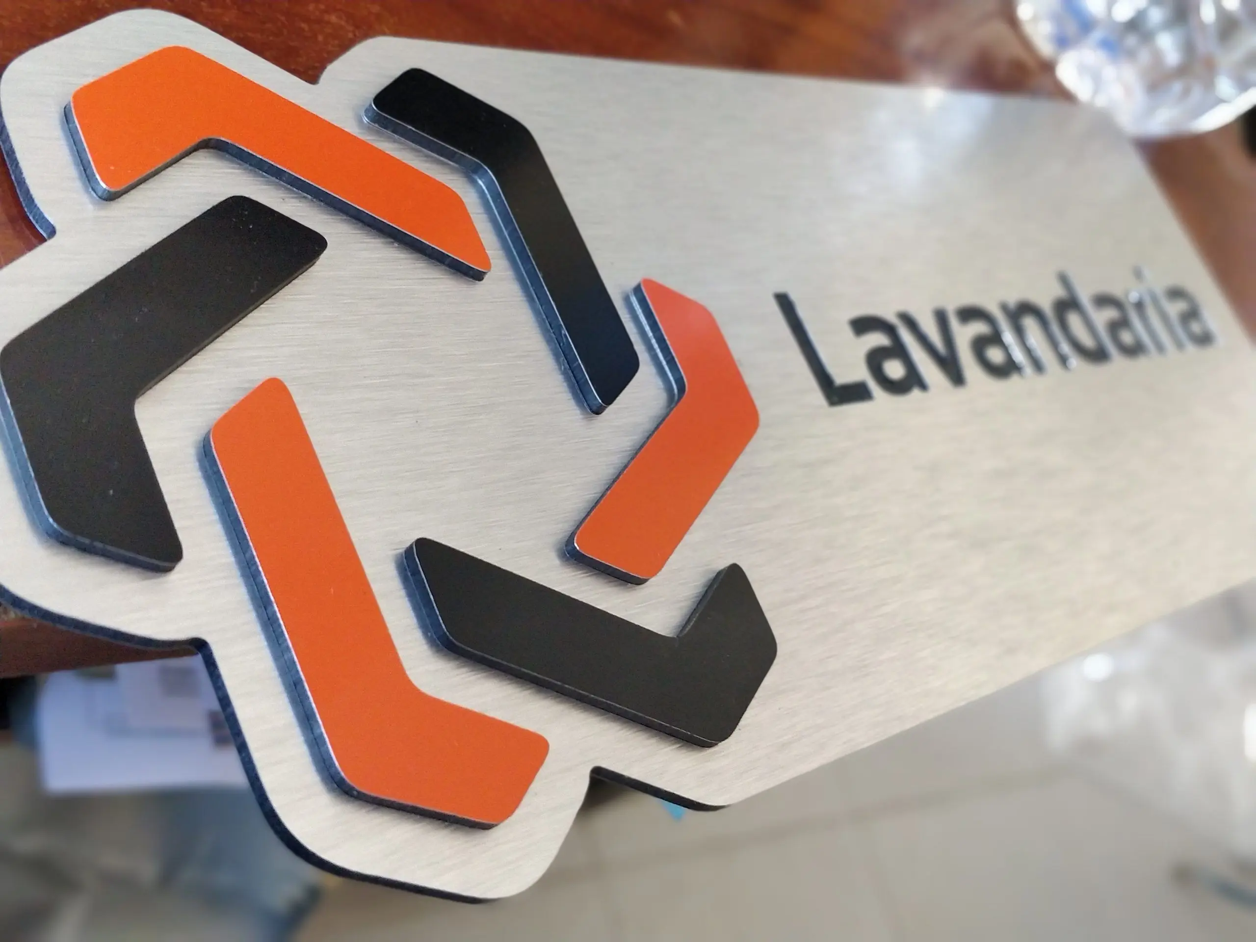 Sinalética indicativa de espaços para o Grupo Querido na Benedita Feito em dibond escovado de 3mm com gravação a fresa e incrustação de dibond preto e laranja